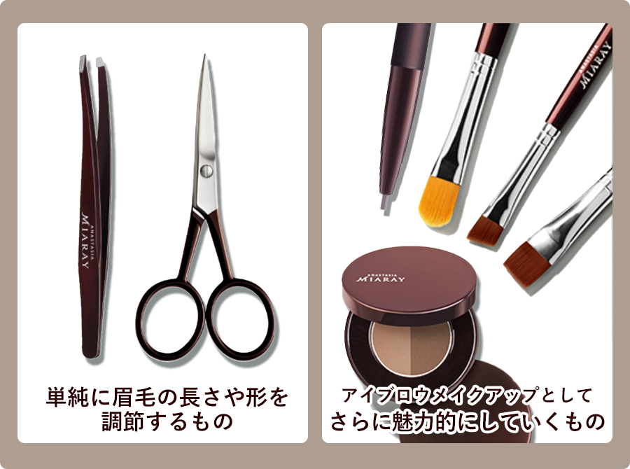 眉毛を整える道具にはさまざまなものがありますが、大きく「単純に眉毛の長さや形を調節するもの」「アイブロウメイクアップとして、さらに魅力的にしていくもの」の2つに分けられます。